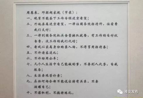 图为周总理侄女周秉德根据日常记录整理后书写的周总理对晚辈们的教育和要求,后来总结提炼为周总理的十条家规。如何过好亲属关?这是周恩来一直在思考的问题。进入和平年代以来,周恩来家过去失去联系的一些亲戚来找的多了,他们中有的只是纯粹出于亲情,但是也有一部分人想托周恩来帮助办一些事情,这让他很伤脑筋。同时,他收养的三个烈士的孩子在外面是不是能够像普通公民一样地遵守国家法纪,不搞任何的特殊?在自己的亲戚和友人中,会不会有人利用自己的影响去谋取一些个人私利?这些问题让周恩来感到放心不下。于是,周恩来对这三个孩子提出要立个规矩,并说:这个规矩不光是给你们的,也是给我们周家所有亲戚朋友的,大家都得遵守,谁要不遵守你们也可帮我监督。周恩来当场立下了“十条家规”,让孩子们一一记在纸上。“十条家规”的内容涉及日常生活中吃饭、住宿、出行等方面,甚至连“排队就餐”都作了规定,可见细化到何等程度。家规虽为家事,却展现了周恩来严守党的纪律的崇高境界。