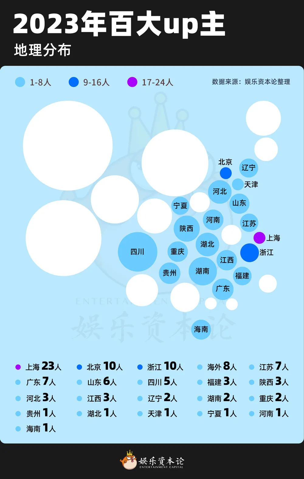 小娱统计了2023年百大UP主的数据,其中有23名UP主暂居上海,10名UP主坐标北京,7名up主定位广东。而超过五成的百大UP主,则在浙江、福建、湖北、湖南等省份内的各个一二线城市。