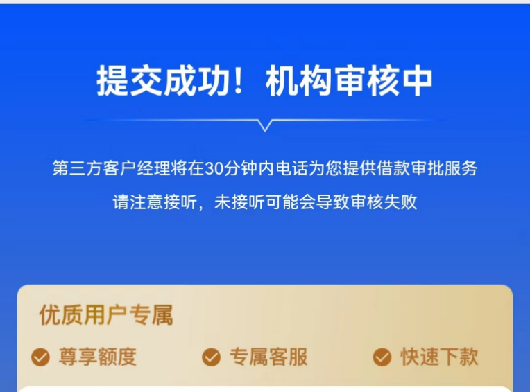 除了推送链接,该公众号菜单栏还设有“极速申请”“备用金”“额度申请”等功能,在尝试后点击后,均跳转进入其他产品的借款申请页面。提交身份、工作等基本信息后,则进入机构审核流程,随后记者便接到了所在地线下中介打来的电话,被邀请进行信息确认、获得贷款邀约等。