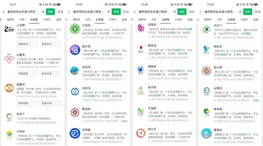 例如,“晶安汇”的认证主体为重庆市南岸区永道小额贷款有限责任公司,以其为主体的公众号高达40多个,名称包括:八点用、心意花、速意用、云贝下......