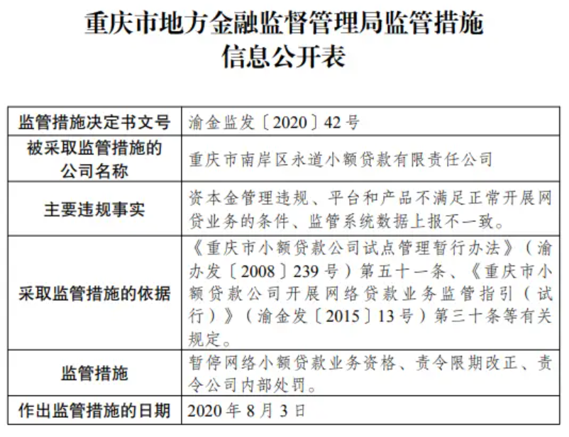 值得注意的是,重庆永道小贷在2020年因3项违规被重庆地方金融管理局暂停网络小贷业务资格,至今仍未恢复。