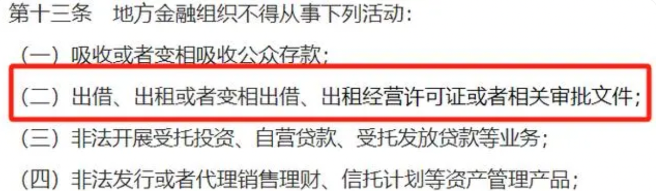 在大多数地方监管的小贷管理办法或评级办法中,小贷公司出借牌照是明令禁止的行为。例如,《湖南省地方金融监督管理条例》第十三条第二项规定,地方金融组织不得从事出借、出租或者变相出借、出租经营许可证或者相关审批文件。