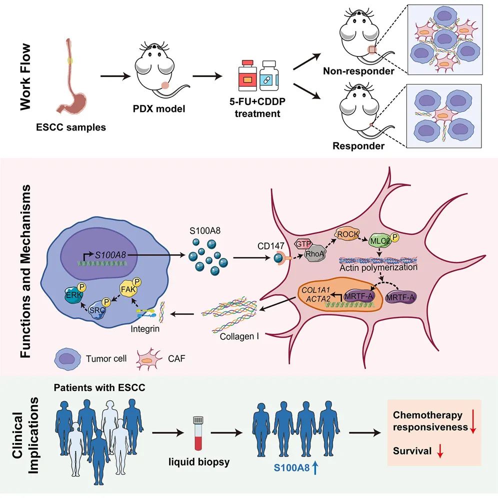 2024年5月21日,国家癌症中心/中国医学科学院肿瘤医院吴晨教授团队在Cell Press细胞出版社期刊Cell Reports Medicine发表了一篇论文,题为“Alarmin S100A8 imparts chemoresistance of esophageal cancer by reprograming cancer-associated fibroblasts”。该研究通过构建人源肿瘤异种移植模型(patient-derived xenografts,PDX),系统揭示了食管鳞癌化疗耐药的分子机制,提出了可增强化疗敏感性的潜在治疗靶点和预测化疗反应性的液体活检标志物。