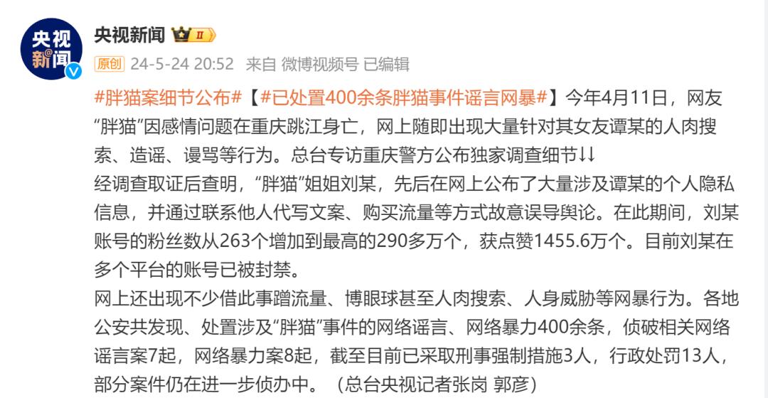 网上还出现不少借此事蹭流量、博眼球甚至人肉搜索、人身威胁等网暴行为。各地公安共发现、处置涉及“胖猫”事件的网络谣言、网络暴力400余条,侦破相关网络谣言案7起,网络暴力案8起,截至目前已采取刑事强制措施3人,行政处罚13人,部分案件仍在进一步侦办中。
