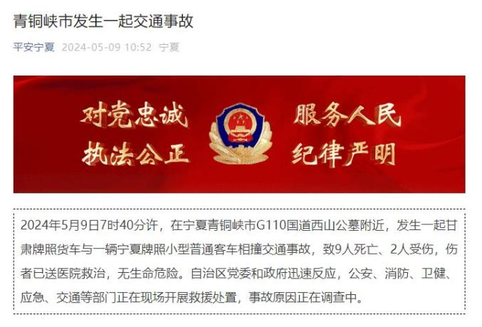◆ 2024年5月9日7时许,一辆面包车沿宁夏吴忠青铜峡市境内110国道行驶时,驶入对向车道与一辆货车相撞,造成9人死亡、2人受伤。初步调查,面包车驾驶人彻夜打牌,身体严重困乏,疲劳驾驶驶入对向车道逆行是造成事故的主要原因。