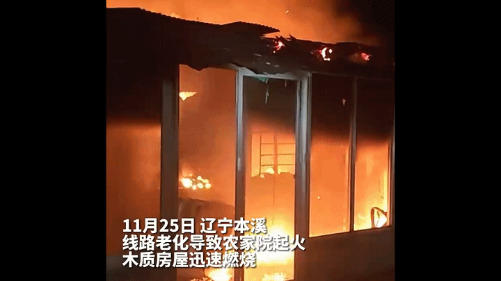 2022年11月25日,辽宁本溪一农家院发生火灾,过火面积50平方米,据悉火灾原因为线路老化所导致木制房屋迅速燃烧。