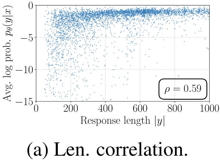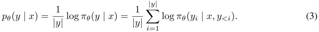 构建在长度上归一化的奖励。很自然地,我们会考虑使用 (3) 式中的 p_θ 来替换 DPO 中的奖励构建,使其与引导生成的似然指标对齐。这会得到一个在长度上归一化的奖励: