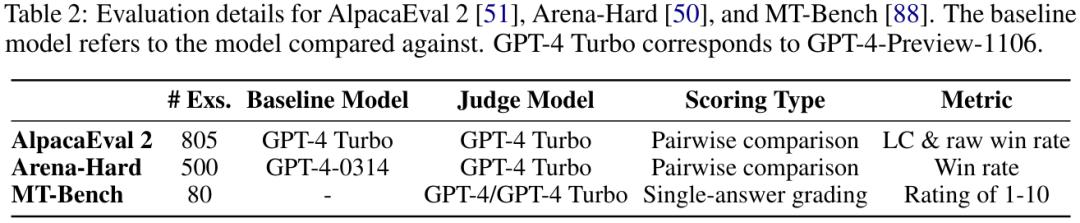 评估基准。该团队使用了三个最常用的开放式指令遵从基准:MT-Bench、AlpacaEval 2 和 Arena-Hard v0.1。这些基准可评估模型在各种查询上的多样化对话能力,并已被社区广泛采用。表 2 给出了一些细节。