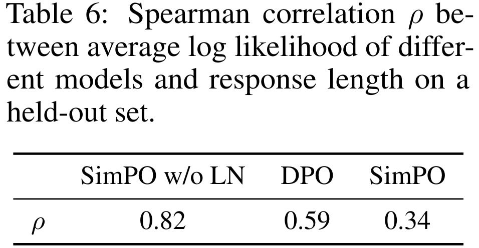 (不包含配分函数)缺乏一个用于长度归一化的显式项,但策略模型和参考模型之间的对数比可以隐式地抵消长度偏见。如表 6 与图 4a 所示,相比于没有任何长度归一化的方法(记为 SimPO w/o LN),使用 DPO 会降低平均对数似然和响应长度之间的斯皮尔曼相关系数。但是,当与 SimPO 比较时,其仍然表现出更强的正相关性。