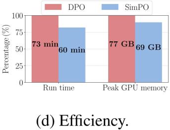 SimPO 的另一大优势是效率,毕竟它不使用参考模型。图 4d 给出了在 8×H100 GPU 上使用 Llama3-Base 设置时,SimPO 和 DPO 的整体运行时间和每台 GPU 的峰值内存使用量。相比于原版 DPO 实现,得益于消除了使用参考模型的前向通过,SimPO 可将运行时间降低约 20%,将 GPU 内存使用量降低约 10%。