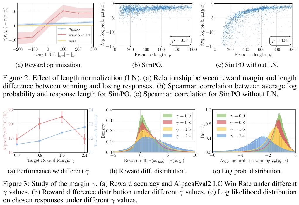 SimPO 的两种关键设计都很重要。表 5 展示了对 SimPO 的每种关键设计进行消融实验的结果。(1) 移除 (4) 式中的长度归一化(即 w/o LN);(2) 将 (6) 式中的目标奖励差额设置为 0(即 γ = 0)。