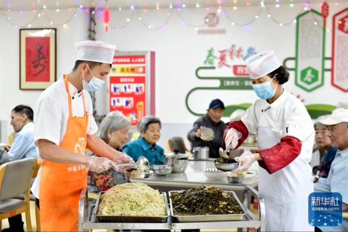 ↑5月25日,在日照市东港区石臼街道中盛幸福苑,工作人员为老人盛饭。新华社记者 郭绪雷 摄影报道