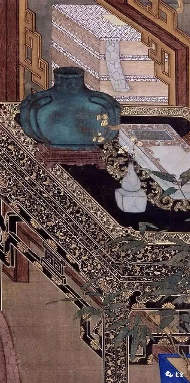 《博古幽思》中,美人被黄花梨安楠木拐子圈扣多宝格环绕着,桌上有哥釉葫芦瓶,瓶内一支梅花。