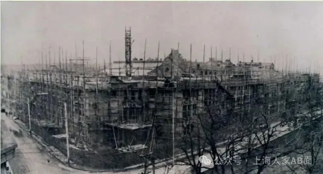 图说:正在建造的公共租界工部局大楼。1904年起,工部局将东起江西中路、南至福州路、西自河南中路,北达汉口路地块买下。1910年,克莱格、朱满和德格雷组成工部局大楼委员会。到1913年更是紧锣密鼓:2月,委员会完成有4项新大楼方案的报告。3月底,纳税人大会审议报告并选定大楼三面围合、原地暂留卫生处、救火站和巡捕房的第3设计方案,预算125万两白银。8月,工务处建筑师特纳完成设计。9月,董事会讨论后送审英国皇家建筑学院院长,原钢筋水泥结构建筑改石结构。1914年10月,承建中标的裕昌泰营造厂开工。没想到那年“一战”爆发,导致所需建材无法运输而影响工程,直到大战结束后恢复正常,于1919年基本完成大楼整体结构。
