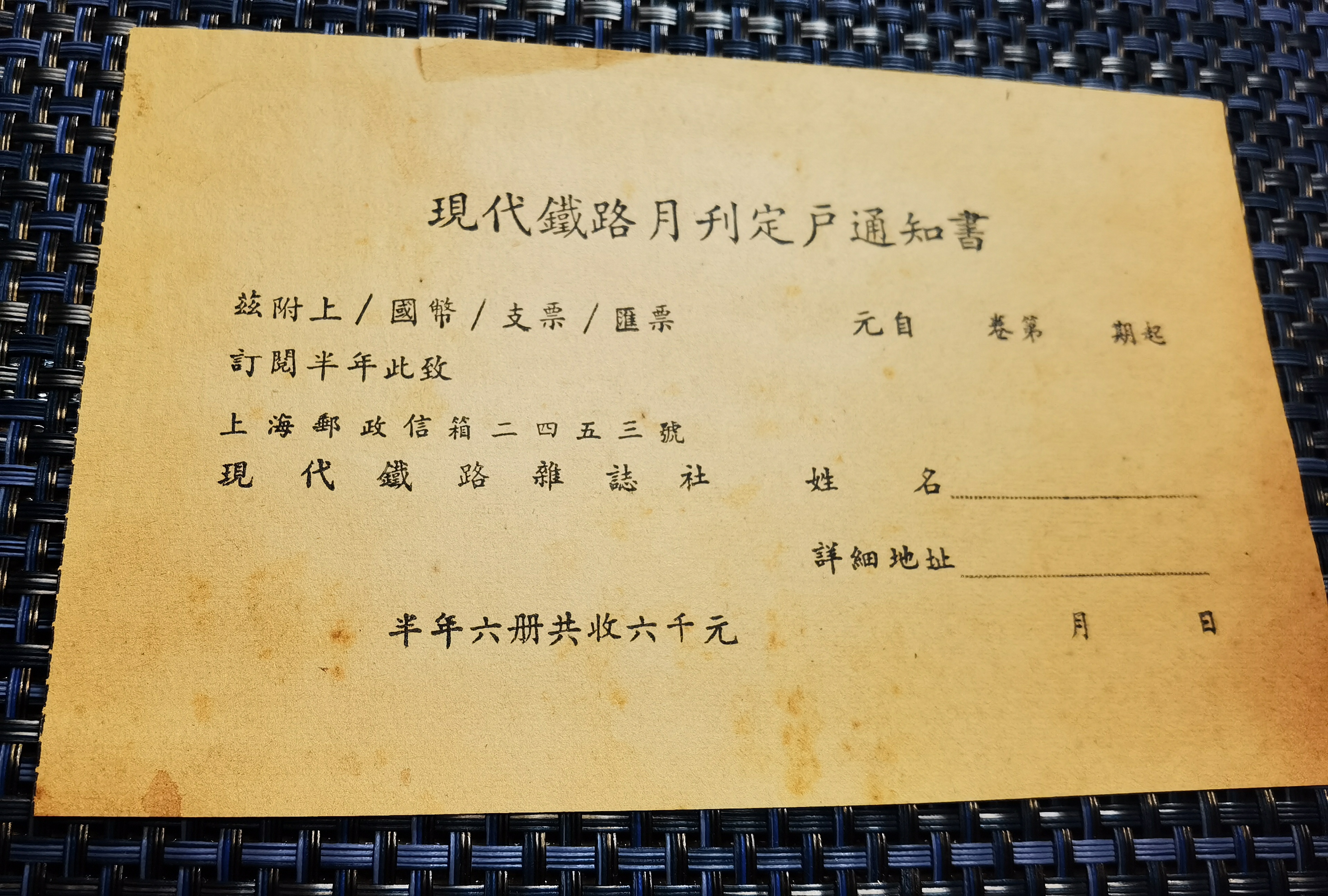我留意到《创刊号》扉页,插夹了一小页黄纸,题为“现代铁路月刊定户通知书”,类似后来纸媒单位的发行单,订阅费是半年六册,共收六千元。民国的六千元,相当于现在的一百二十元,每本二十元,刊价也不便宜。洪绅阐述《现代铁路》创刊宗旨:“交通必须配合国防经济, 图存于今日之世界, 即以积弱未能与列强较一日之短长, 将须直追急起,不容自甘牛后!”