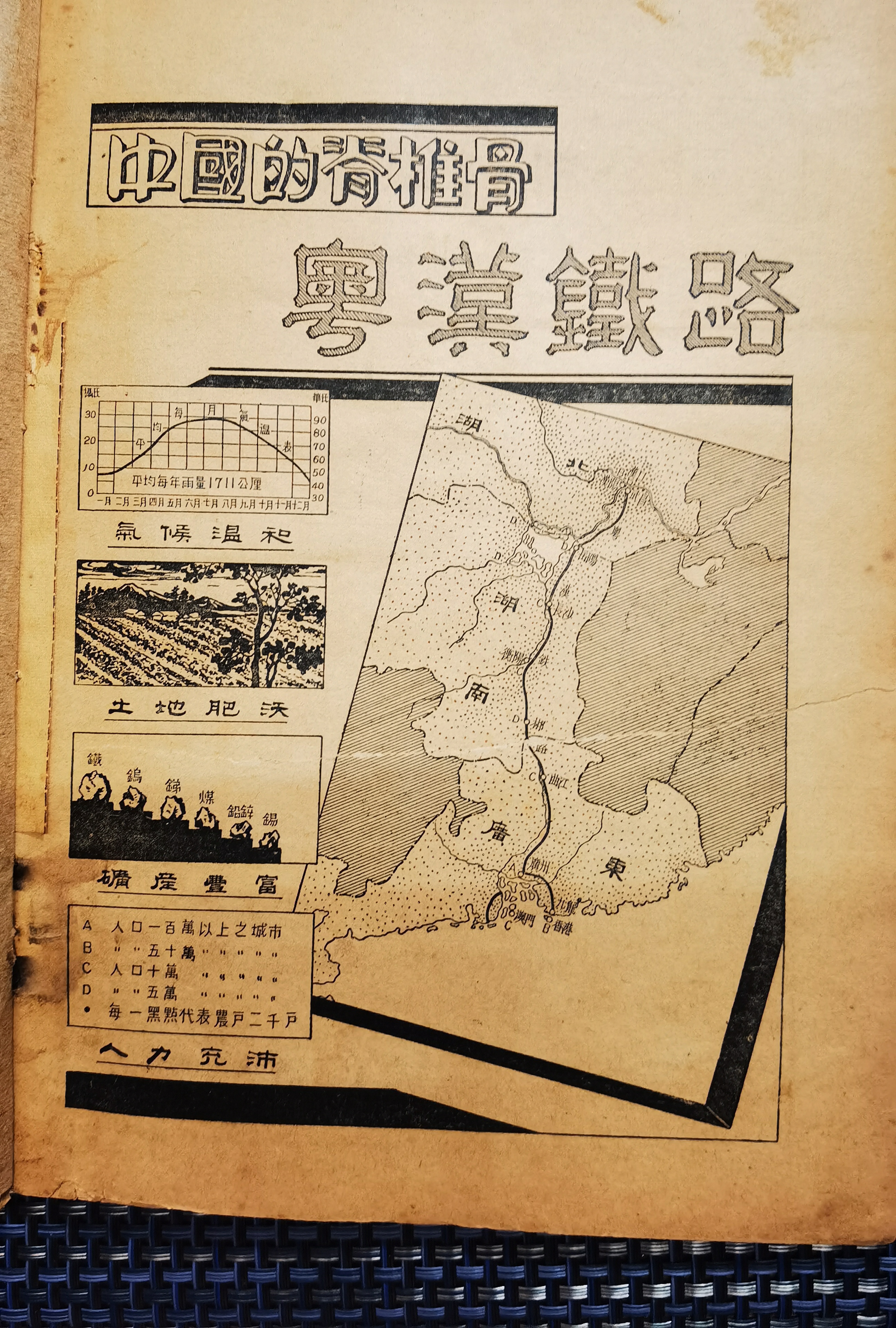 打开泛黄、脆薄的封面,映入眼帘的是“中国的脊椎骨——粤汉铁路”地图,手掌大小的方形图上,右侧为湖北——湖南——广东的铁路线图,标有从北端汉口、武昌、岳阳等城市,经长沙、衡阳等地一路南下至广州、九龙的停站线。左侧,自上而下分别是气候(温和)、土地(肥沃)、矿产(丰富)简介,比如前者标注:平均每年雨量1711公厘(注:应为毫米),有一到十二月份平均每月气温表。随后是一连七页的大幅广告,有正生石棉厂、中法大药房股份有限公司、华生五金行、中国国货银行、仙乐烟厂股份有限公司、新华烟厂和标题为“及时行乐 旅行最宜”的京沪区铁路管理局运务处为沿线各城市打的游线广告。之后每期杂志,广告大都保持了这个量,似乎 “油水”不薄。