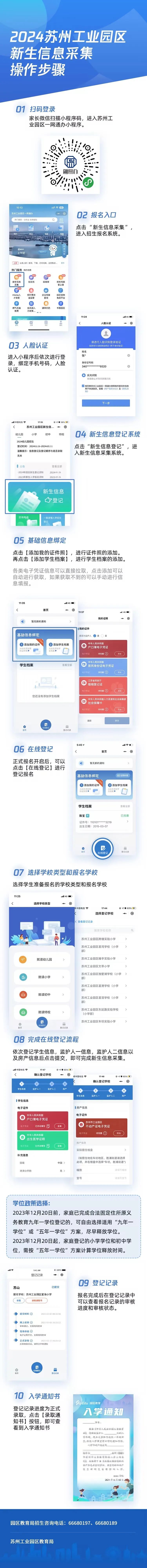 根据《2024年苏州市幼儿园招生工作意见》和《2024年苏州市义务教育阶段学校入学工作意见》,2024年,园区幼儿园、小学、初中入学报名将继续依托园区政务服务平台“融易办”进行新生信息采集、在线登记、在线审核,实现入学事“网上办、掌上办、一次办”,大家也可以通过苏周到APP“入学一件事”栏目进行信息采集。