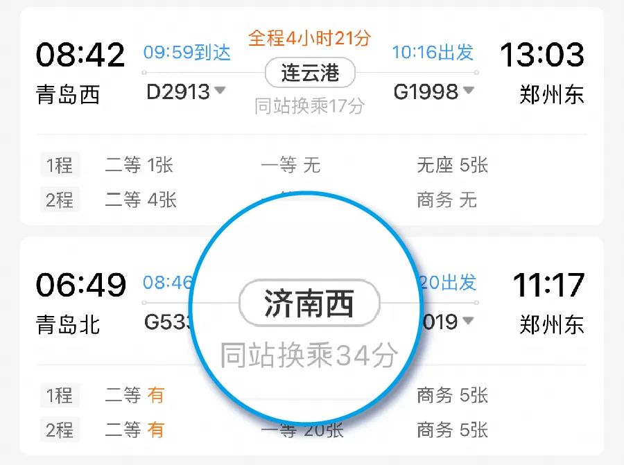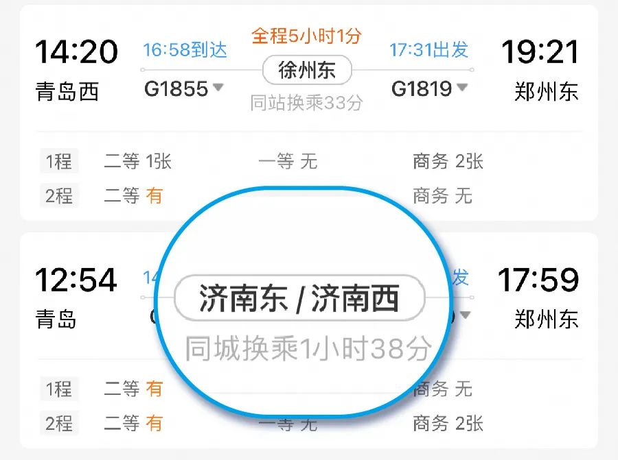 注意!同站换乘≠同城换乘。同城换乘是指第一程到站与第二程发站为同一城市的不同车站,需要通过其他交通方式完成换乘。