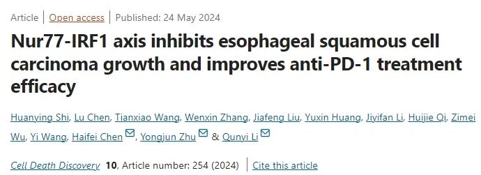 5月24日,复旦大学研究团队在期刊《Cell Death Discovery》上发表了研究论文,题为“Nur77-IRF1 axis inhibits esophageal squamous cell carcinoma growth and improves anti-PD-1 treatment efficacy”。本研究表明Nur77通过直接作用于ESCC细胞,并通过下调IRF1和PD-L1的表达来增强抗肿瘤免疫,从而发挥重要的抗癌作用。本研究提出了Nur77和/或IRF1可以作为ESCC独立的预后生物标志物或治疗靶点的可能性。