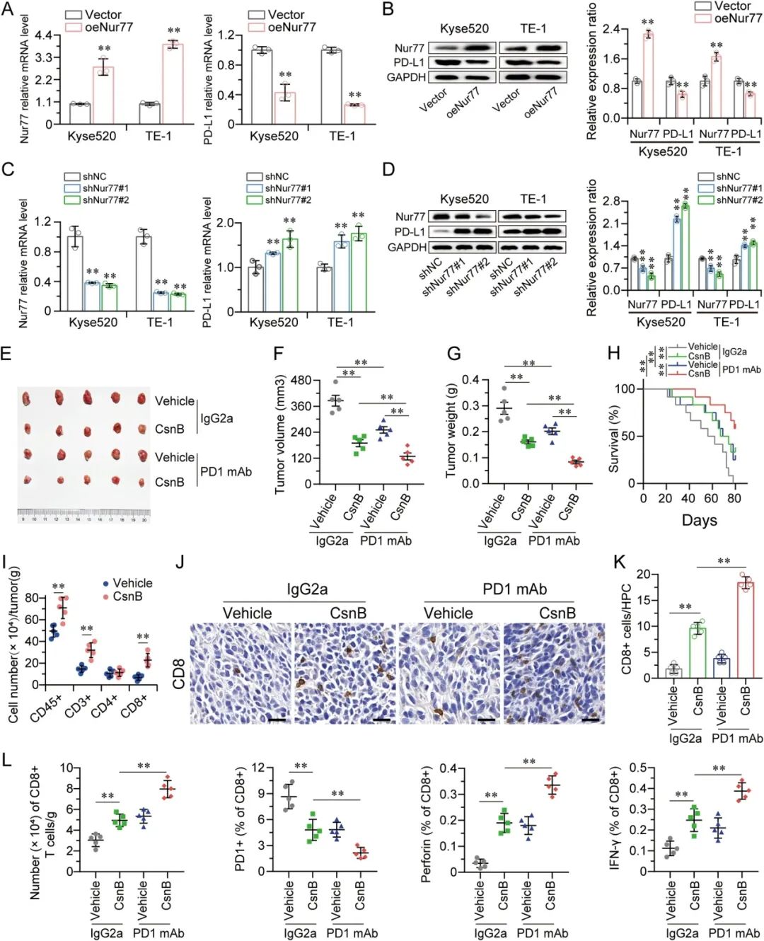 由于PD-L1的表达受转录因子IRF1的调控,研究人员接下来检查是否靶向Nur77可以增强PD-1抑制的抗癌效果。在Nur77过表达和沉默细胞中,PD-L1的表达在mRNA和蛋白质水平上均与Nur77表达呈负相关。本研究结果证实,仅使用CsnB疗法即可在AKR模型小鼠中抑制肿瘤生长和体重。正如预期的那样,单独使用抗PD-1疗法对肿瘤体积、肿瘤重量或小鼠存活率几乎没有影响。更重要的是,将Nur77靶向治疗与抗PD-1疗法联合使用,使这两种疗法的治疗效果比单独使用任何一种疗法都更有效。为确定CsnB依赖的抗肿瘤活性是否与免疫学景观的变化有关,研究人员通过流式细胞术对肿瘤中的免疫细胞进行了分析。研究人员随后收集了AKR肿瘤组织进行进一步研究。根据免疫组织化学染色和流式细胞术分析,组合治疗组中CD8+T细胞的浸润程度可能更高,这也是其疗效更好的原因。研究结果表明,靶向Nur77可能是提高抗PD-1疗法在ESCC患者中疗效的一种有前景的治疗策略。