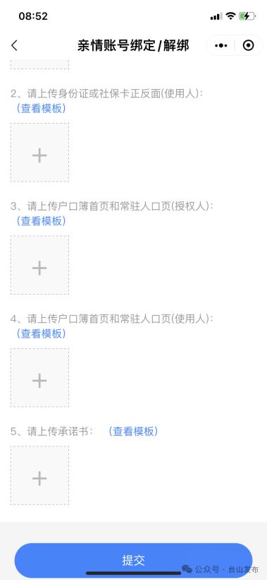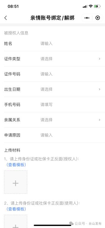 3.进入【亲情账号绑定/解绑】业务办理界面后,在“我的家人”点击“+”按钮,依次填写要绑定人员信息:【姓名】-【证件类型】-【证件号码】-【出生日期】-【手机号码】-【亲属关系】-【申请原因】;再点击材料上传按钮,提交相关材料,完成后点击提交按钮即可提交绑定申请;