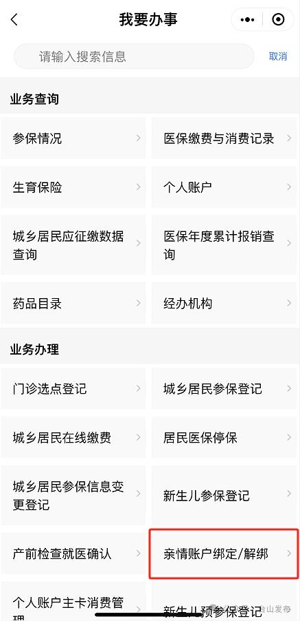1.手机端使用微信小程序—粤医保,点击登录进行刷脸识别登录,进入应用程序首页后点击右上角切换当前参保地市—业务办理—查看更多—业务办理—选择【亲情账户绑定/解绑】