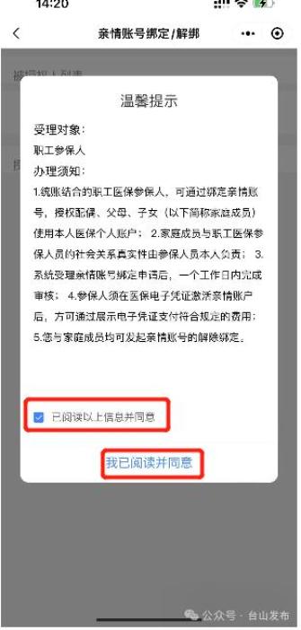 2.在【亲情账号绑定/解绑】界面,弹出温馨提醒后请仔细阅读,然后勾选【已阅读以上信息并同意】最后点击我已阅读并同意按钮。