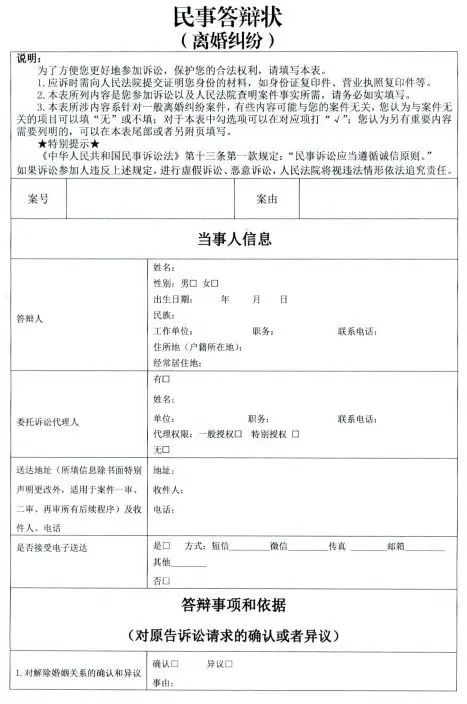 2024年3月4日,最高人民法院、司法部、中华全国律师协会联合印发了《关于印发部分案件民事起诉状、答辩状示范文本(试行)的通知》,针对多种常见纠纷,制发要素式起诉状、答辩状的示范文本。当事人只需根据事实,简明扼要的填写相关信息,即可快速形成诉讼材料,为当事人提供便利的同时,案件争议焦点也一目了然。