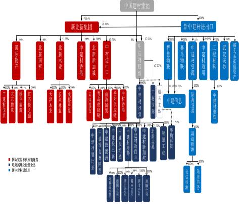 为化解债务风险,整合贸易业务资源,助力贸易业务高质量发展,中国建材集团通过协议转让的方式开展了贸易板块业务重组,具体途径一是中建材海外经济合作有限公司(简称中建材海外)将环保业务资产打包组合协议转让给中建材国际物产有限公司(简称国际物产)、将招采平台资产打包组合协议转让给中国建材集团全资子公司北新建材集团有限公司(简称北新集团);二是中建材集团进出口有限公司(简称中建材进出口,含所属公司)在上述转让完成后,将所持中国建材国际新加坡公司100%股权、中国建材国际新西兰有限公司100%股权、中建材海外100%股权协议转让给中建材投资有限公司(简称中建材投资);三是中建材智慧物联有限公司将所持中建材智慧工业科技有限公司(简称智慧工业)100%股权协议转让给中材国际;四是国际物产将所持中建材通用技术有限公司89.15%股权及应收中建材资产管理有限公司(简称资产管理公司含所属公司)债权协议转让给中建材进出口。五是中建材进出口将所持国际物产100%股权和中国建材(香港)有限公司100%股权协议转让给北新集团;六是北新集团将所持北新集团坦桑尼亚有限公司(简称北新坦桑)73.79%股权协议转让给中建材投资。七是北新集团将所持北新房屋有限公司81%股权协议转让给资产管理公司;八是北新房屋将所持北新房屋(成都)有限公司100%股权转让给北新集团控股子公司北新国际木业有限公司。本次整合完成后,北新集团发展国际、国内供应链业务,搭建数智化服务平台,推动贸易业务做优、做强,成为有行业影响力的现代数智供应链集成服务商。中建材投资聚焦境外属地化建材海外仓经营业务,中建材进出口成为壳公司,通过出售资产偿还债务。整合完成后的示意图如下: