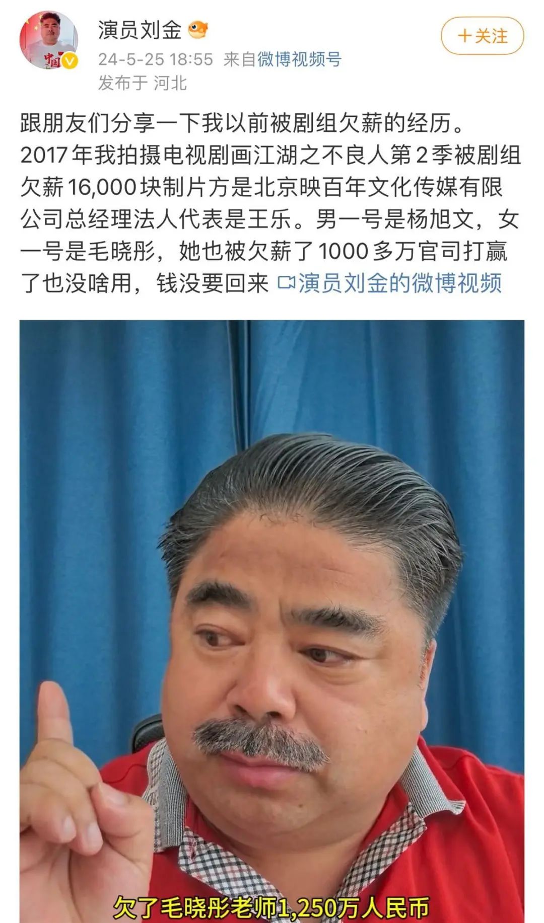 25日18:55,曾在电影《夏洛特烦恼》等影视作品中出演龙套角色的刘金在微博发布了一条两分钟的视频。视频中刘金提到,要跟大家分享“我以前被剧组欠薪的经历”,在刘金的讲述中,自己曾参与2017年开机拍摄的《画江湖之不良人》,但被剧组欠薪16000元,且至今仍未要回,而被欠薪的不仅仅是他一个小龙套。“我们这个戏的女一号毛晓彤老师起诉了这个公司,并且胜诉了,执行的时候说这个公司名下没有任何可执行的财产……(该公司)欠了毛晓彤老师1250万人民币。”记者查询资料后发现,刘金视频里提到的《画江湖之不良人》于2017年拍摄,出品方为北京映百年文化传媒有限公司,导演之一是《苍兰诀》导演伊峥。
