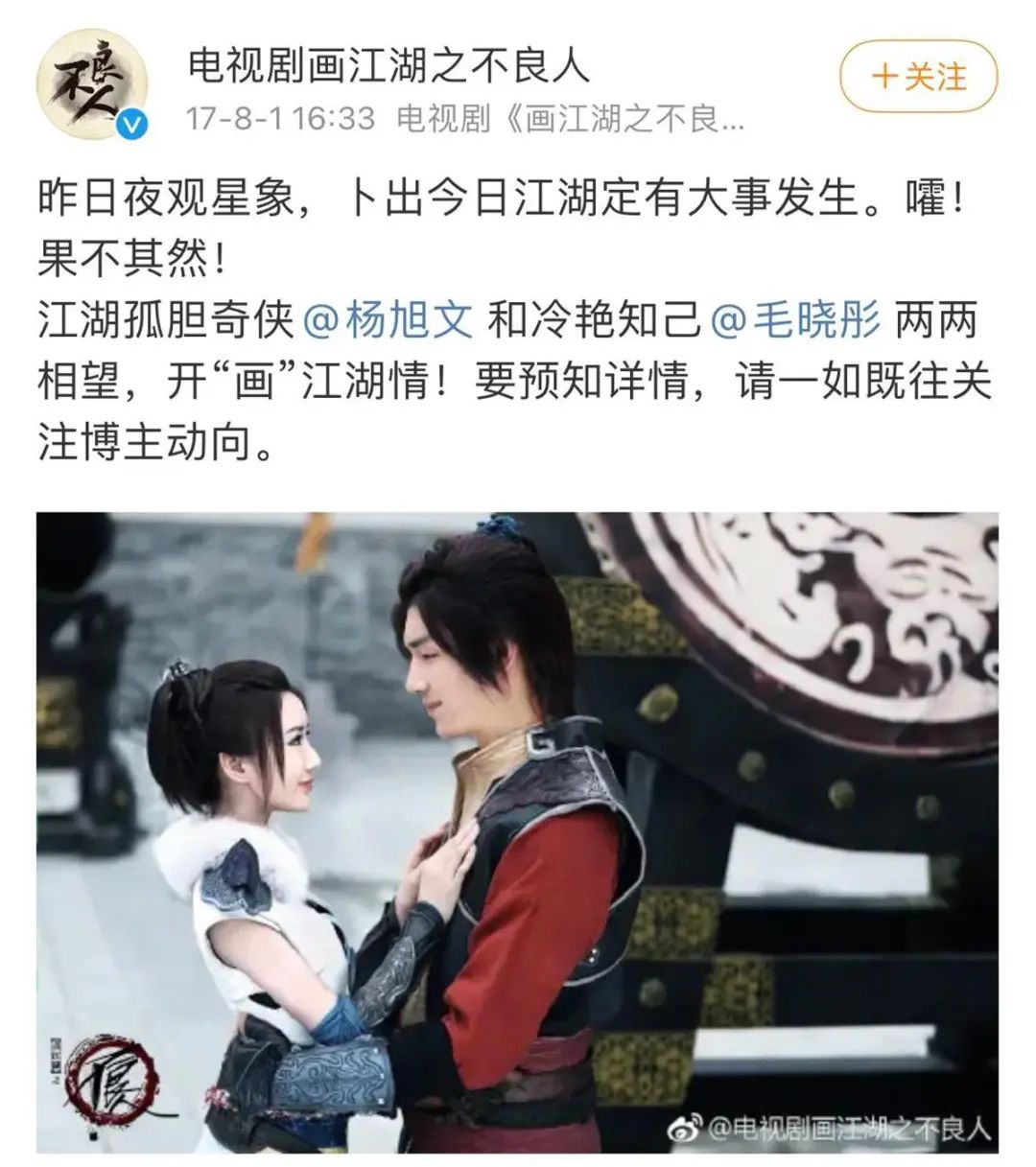 而就在2017年8月1日,《画江湖之不良人》官微还公布了剧集男、女主角的阵容,杨旭文、毛晓彤赫然在列,也侧面印证了刘金提到的剧集就是这一部。
