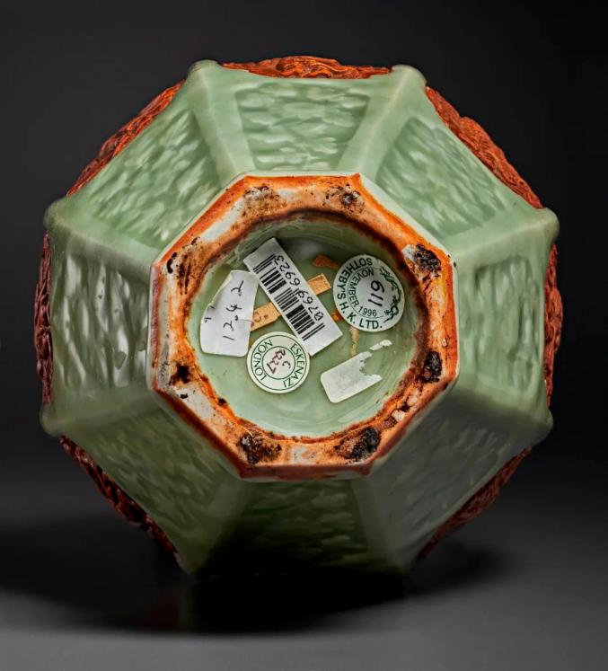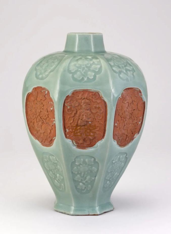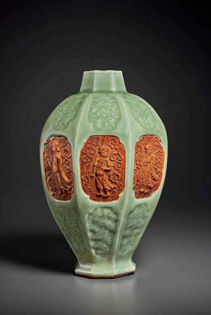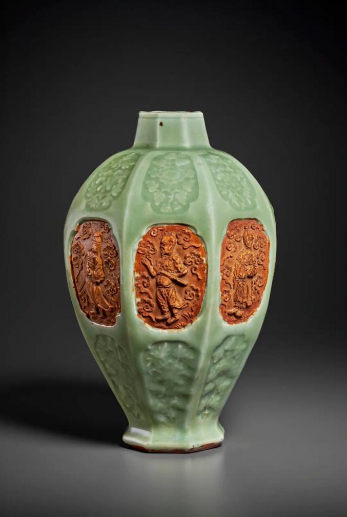 龙泉窑青釉露胎开光八仙纹梅瓶