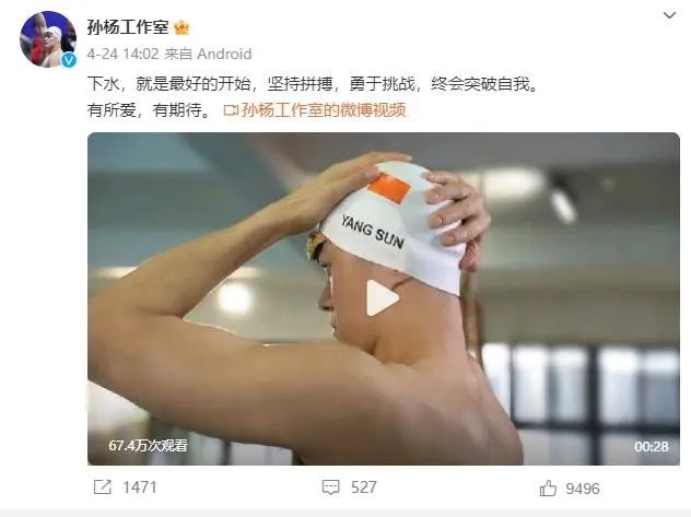 4月24日,孙杨工作室在其社交媒体上发布了一段视频,展现出了孙杨对重回泳池的无限期待。