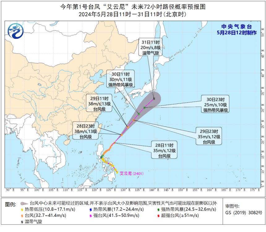 据中央气象台,今年第1号台风“艾云尼”的中心今天(28日)11时位于距离琉球群岛那霸市南偏西方向约820公里的洋面上,中心附近最大风力有12级(35米/秒),中心最低气压970百帕。“艾云尼”将以每小时30公里左右的速度向东北方向快速移动,强度变化不大。台风“艾云尼”