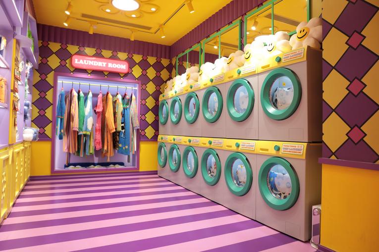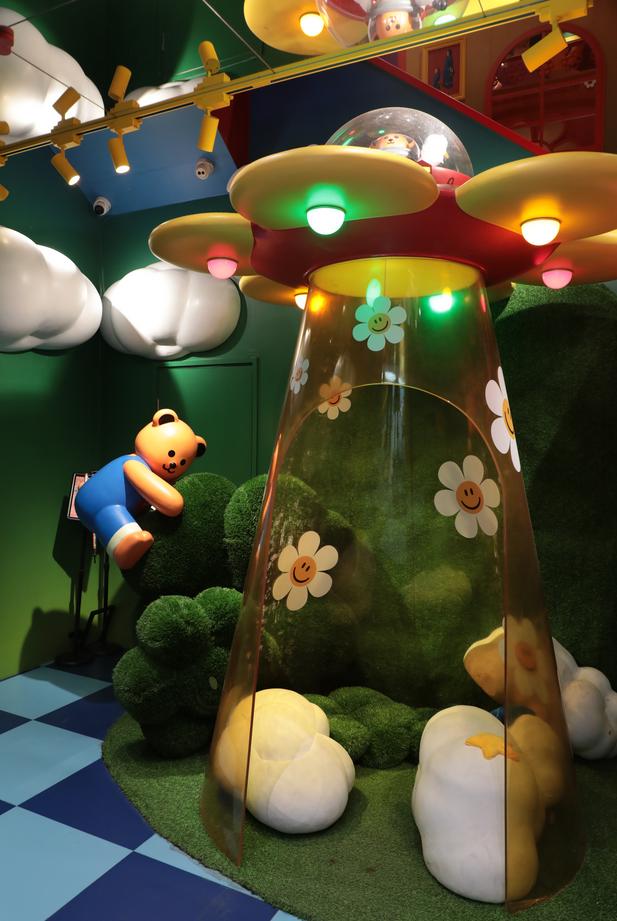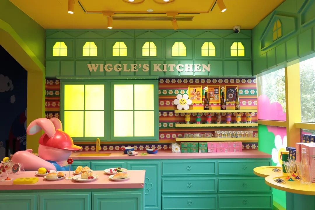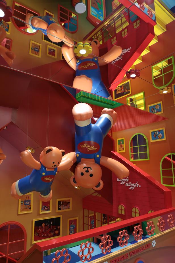 色彩鲜明的楼梯、悬空的小熊、花朵形状的飞船……走进wiggle wiggle,仿佛置身于一座游乐园中。整个门店共四层,每层主题各异,整体空间以红、黄亮色为主,“多巴胺”式的快乐氛围直扑人心。