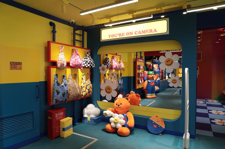 90度侧身房潮流针织手拎袋、无线耳机尼龙包,以及各式各样的睡衣浴袍,在这里你可以pick爱豆同款,巨型的wiggle熊也会“出没”在你身边,吸引顾客打卡合影。每个角落里,琳琅满目的实用萌物令人目不暇接。