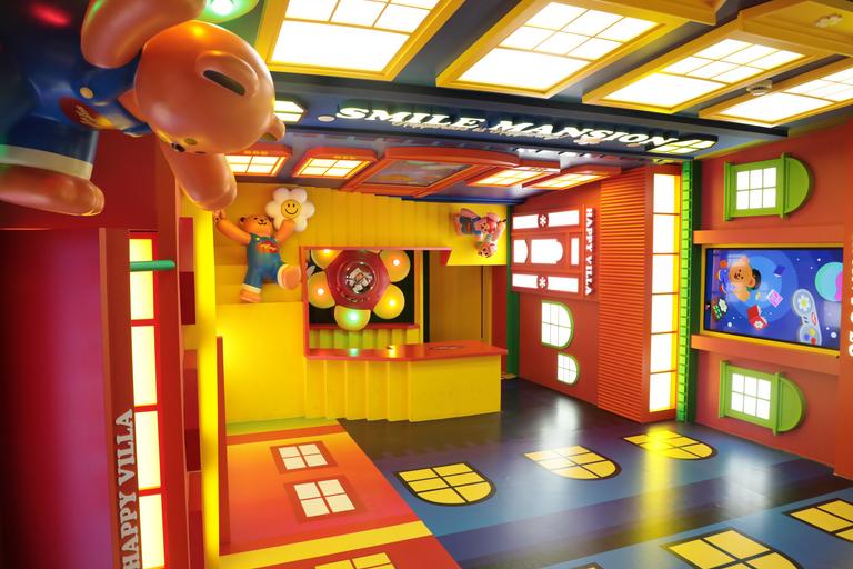 从一楼入口处的走廊踏入到小熊的“森林领地”,笑脸花作顶的淡黄色透明小屋别出心裁,与周围生机盎然的绿意交织在一起。