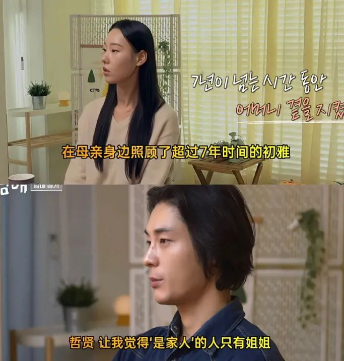 相对于外部社会单调压制、空洞日常的商品化关系,家庭领域中的私人关系更易扮演个体逃避无情世界的避难所。节目中的初雅姐弟,因父母早年离异,母亲长年病重,在公布血亲身份时并没有温馨的家庭视频物料的展示,而是直接从仅有的一张童年影像跳跃到成年后的照片。但这并不代表姐弟俩就缺失了十多年的成长教育,父母的缺席让他俩成为所有手足中最相依为命的一对。初雅以姐姐的身份撑起了小家庭的小秩序,为了就近照顾患有慢性病的母亲,放弃了去首尔攻读大学的机会,她也是嘉宾中工作最繁忙的,经常白天上班晚上才回到别墅录制节目。