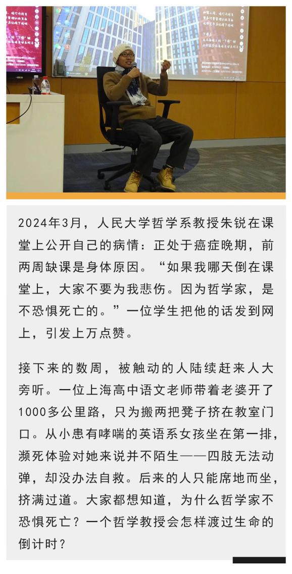 今年4月2号,一堂普通的周二哲学课上,朱锐跟学生们说,“告诉你们一个好消息,我的化疗停止了。当然,这不是说我痊愈了,是因为治不好,干脆就不治了。这下我就能不迟到,每周都来给你们上课了。”