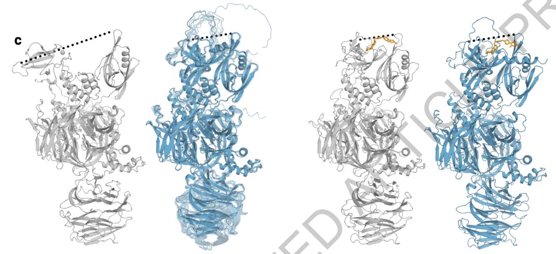 图片来源: 《Accurate structure prediction of biomolecular interactions》AlphaFold3:构象覆盖度有限。AlphaFold3对蛋白质Cereblon在有/无配体结合条件下的预测显示出局限的构象变化。灰色:真实结构;蓝色:AlphaFold3预测结构。造成现有模型难以预测动态构象分布的主要原因是,蛋白质结构数据集仅有实验解析的单一静态结构或结合态结构,结构数据集的偏置导致了模型难于预测真实的分布。另一方面,物理知识的缺失导致模型无法模拟分子动力学行为,从而与真实世界对齐。