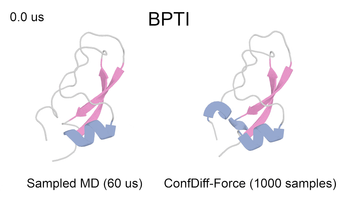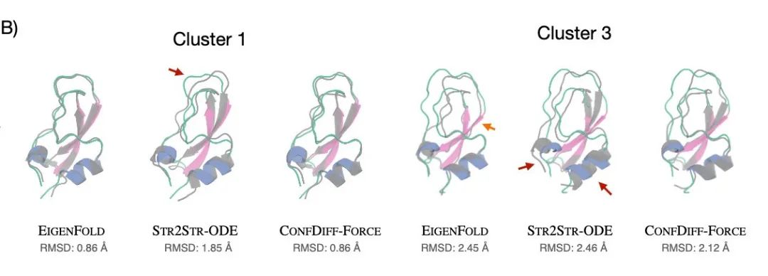 图 4:模型预测 BPTI 亚稳态蛋白质具体例子(真实结构涂色,采样结构灰色)3. 力场引导模型采样