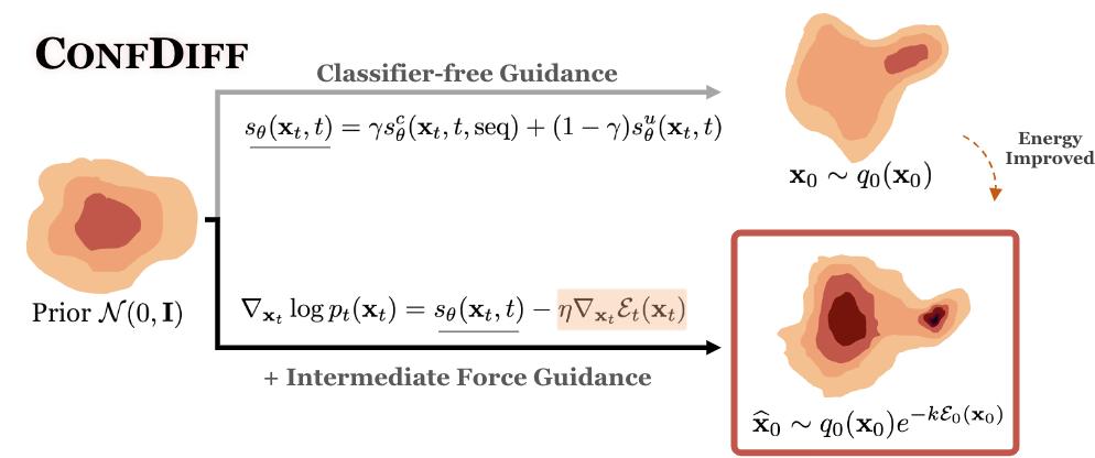 图 1:COFFDIFF 算法示意图在此基础上,为使分布符合能量玻尔兹曼分布,研究者提出了能量与力场引导方法,其中最重要的是计算中间时刻的能量梯度(即力场)
