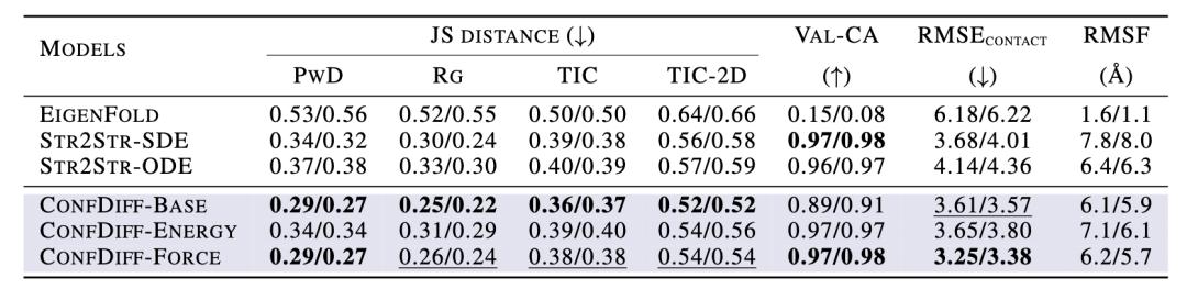在预测样本分布和预测残基接触的 RMSE 等指标方面,CONFDIFF 优于已有的 EigenFold 和 Str2Str 等模型。值得注意的是,引入能量和力场引导在保持了构象多样性的同时提高了构象的生成有效性,证实了物理引导方法的优势。力场引导的方法也相对更优于能量引导的方法。