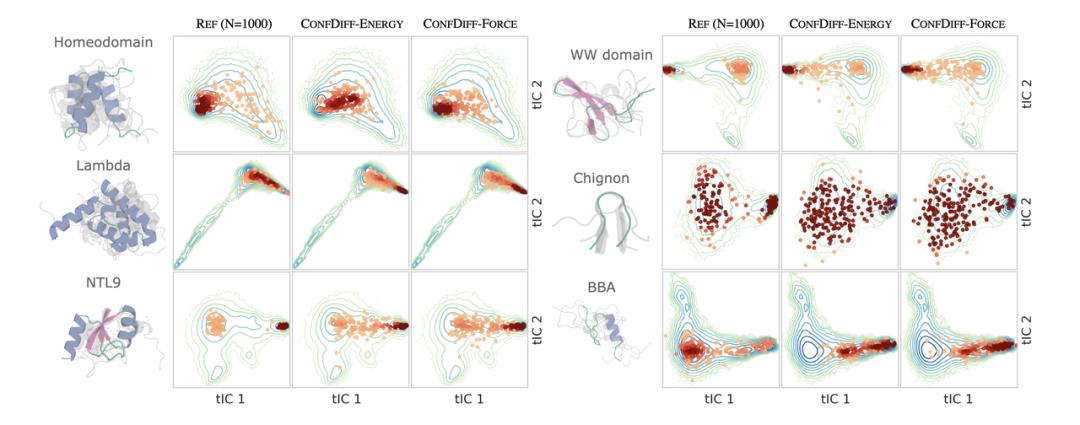 研究者在快速折叠蛋白质数据集上评估模型预测构象分布的能力。评估了生成样本和真实分子动力学样本分布之间的 Jensen-Shannon 距离 (JS Distance),以及多样性的有效性得分和 RMSF,残基之间预测接触率 RMSE。表 1 展示了各模型预测构象的性能,图 2 中展示了 TIC(time-lagged independent components)投影中的样本分布。
