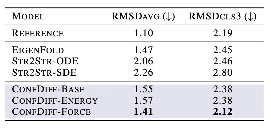 表 1:快速折叠蛋白质(fast-folding proteins)上各模型预测构象性能
