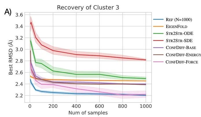 研究者评估了模型预测 5 种 BPTI 原生折叠态附近亚稳态的质量。指标为 5 个聚类的最佳 RMSD 平均值(RMSDAVG)和最难采样的聚类 3 的 RMSD 平均值(RMSDCLS3)。如表 2 所示,CONFDIFF 在预测不同亚稳态方面有更好的能力,力场引导的模型在这两个指标上都表现最好。通过进一步比较不同采样样本量下的指标来评估模型的采样效率,如图 3 所示。CONFDIFF 模型对聚类 3 的采样效率都很好,同样地,力场引导的模型也取得了最好效果。