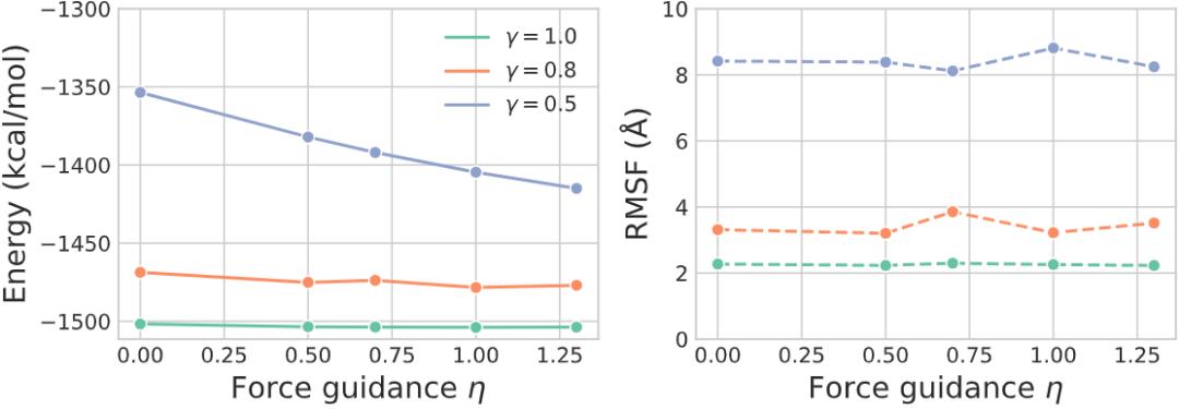 图 5:在不同的力场引导 (η) 和序列条件 (γ) 下,WW Domain 的采样构象的能量 (左) 和多样性 (右)总结:通过物理信息引导向真实世界迈进