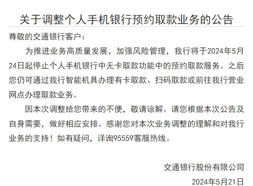 5月21日,交通银行发布公告称,将于5月24日起停止个人手机银行无卡取款功能中的预约取款服务。之后客户仍可通过该行智能机具办理有卡取款、扫码取款或前往该行营业网点办理取款业务。