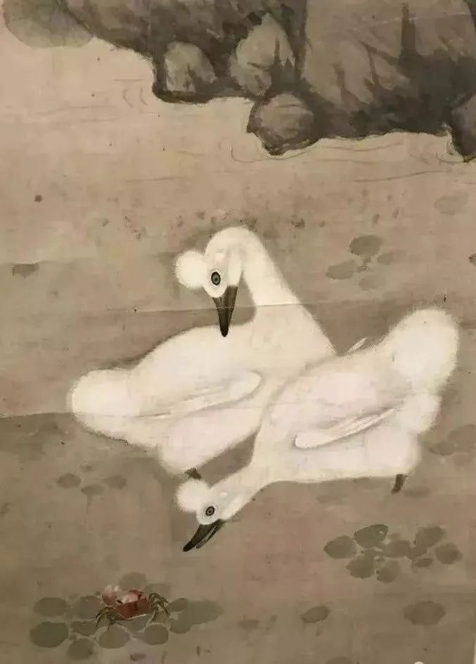 荷池边两只乌嘴凤头白鸭栩栩如生,一只背头打理羽毛,另一只紧盯旁边的小螃蟹,十分生动有趣。