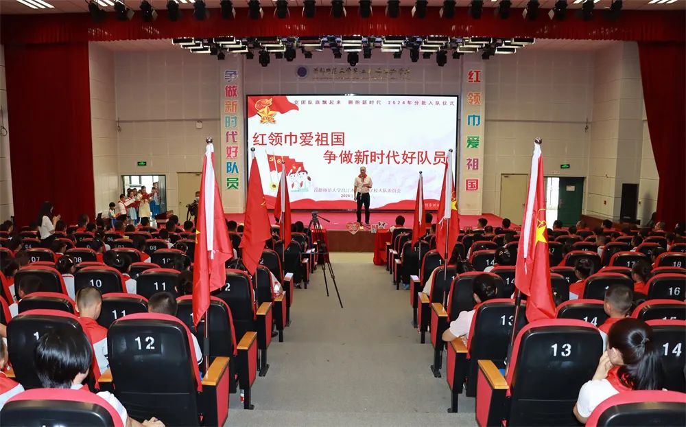 入队仪式现场(符长雨 摄)伴随着激昂的出旗曲,入队仪式拉开序幕。新队员齐唱《中国少年先锋队队歌》,表达对少先队的热爱和向往。仪式宣读了《组建年级少先队组织的决定》,宣布了116名新队员名单;老队员为新队员授红领巾,新队员在队旗下庄严宣誓。随后,与会领导为新中队授中队旗,并为中队辅导员颁发聘书。新队员代表上台发言。